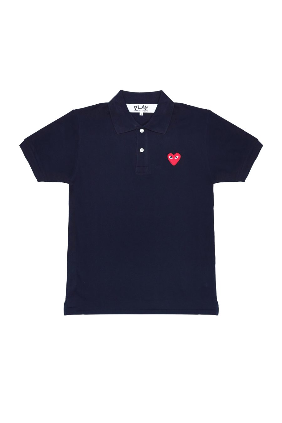 Navy classic polo shirt from Comme Des Garçons Play. Featuring signature heart embroidered patch in red, polo collar, short front button fastening, short sleeves and straight hem.