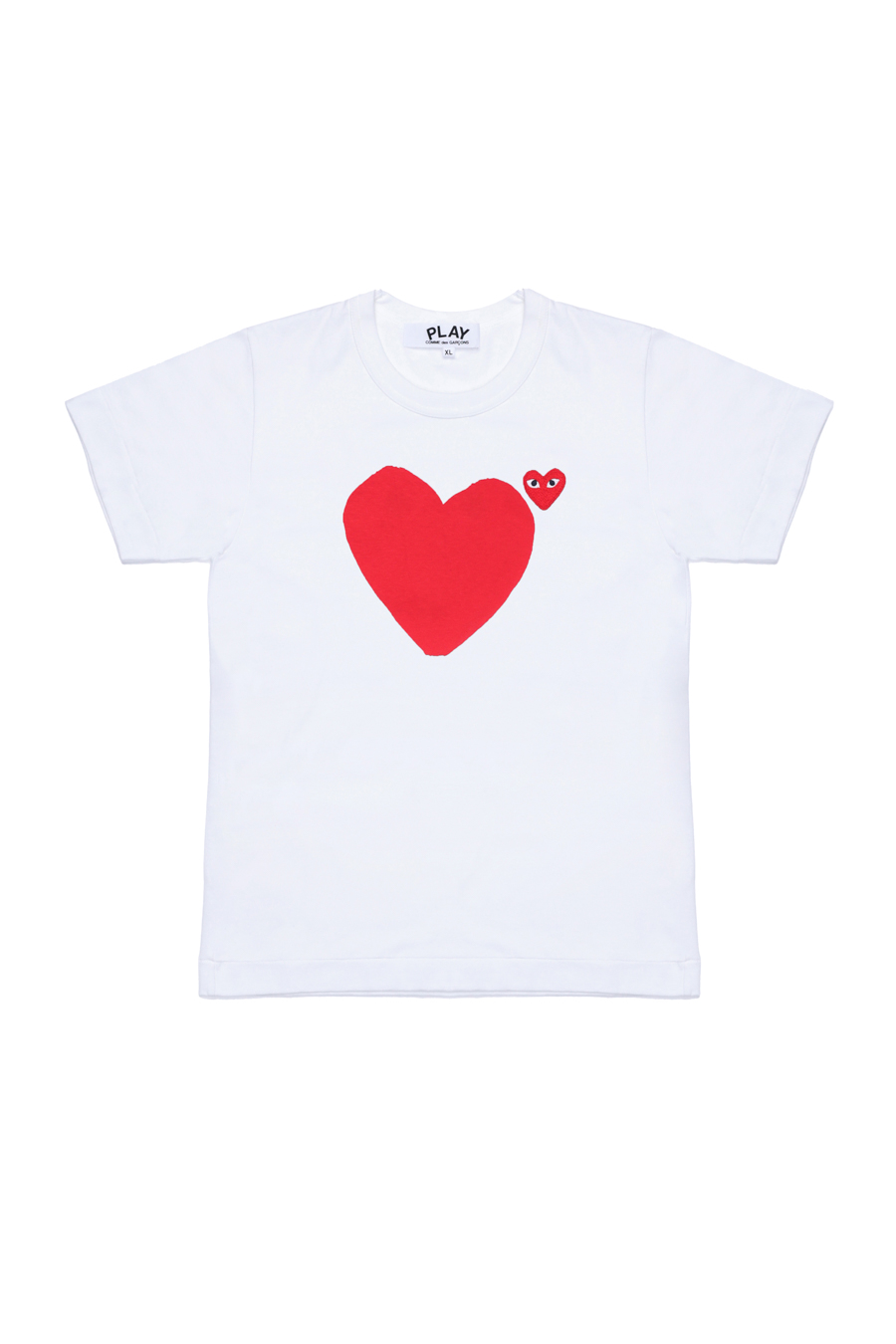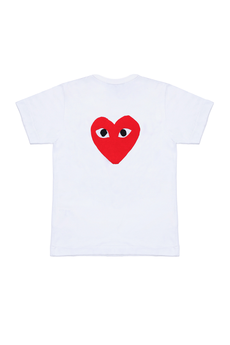 White cotton T-Shirt from Comme Des Garçons Play. Featuring red printed logo to the rear, a signature red logo patch at the front, relaxed fit, round neck, short sleeves, and a straight hem.