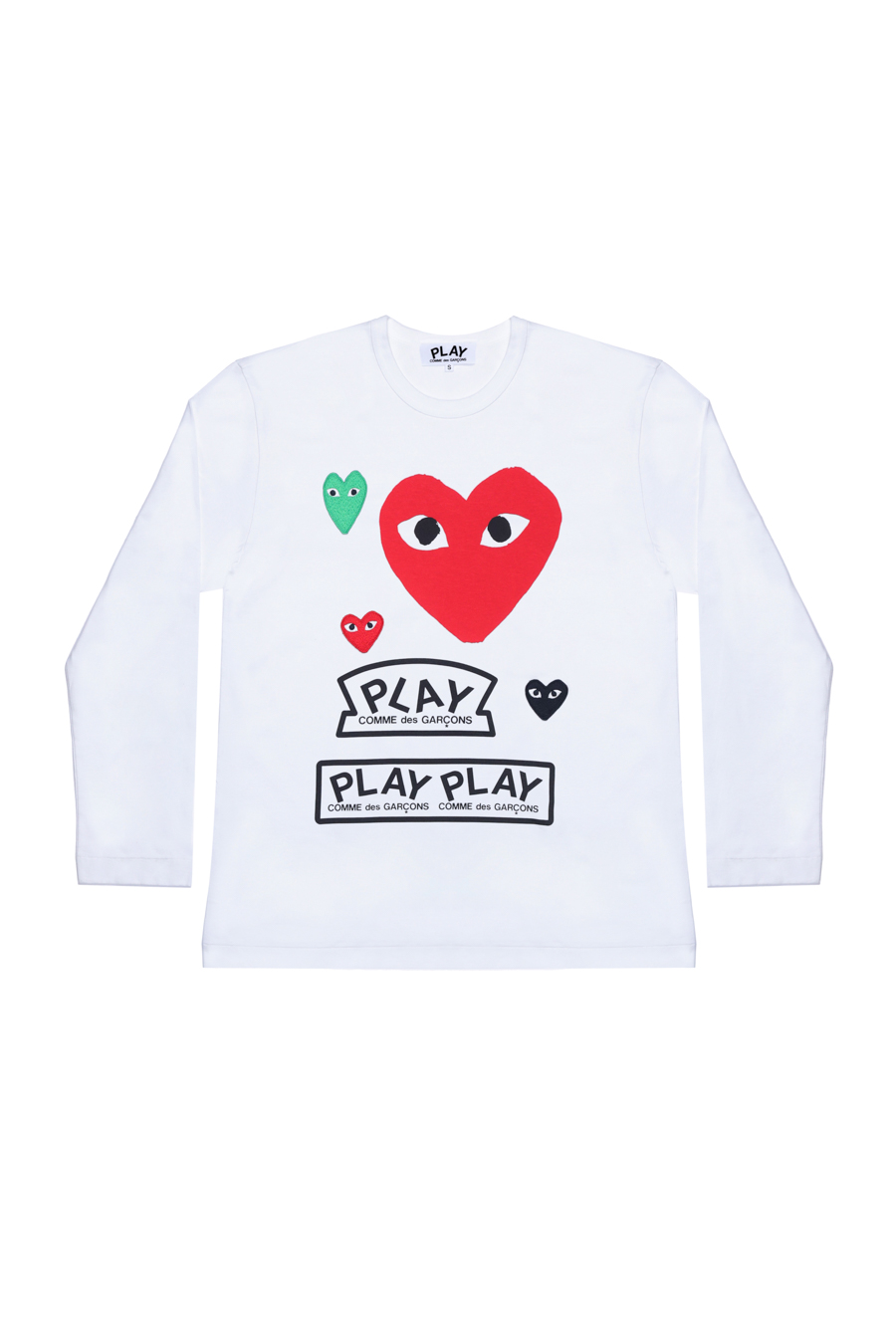 White cotton multi logo T-Shirt from Comme Des Garçons Play. Featuring round neck, long sleeves, heart pendant and logo print to the front.