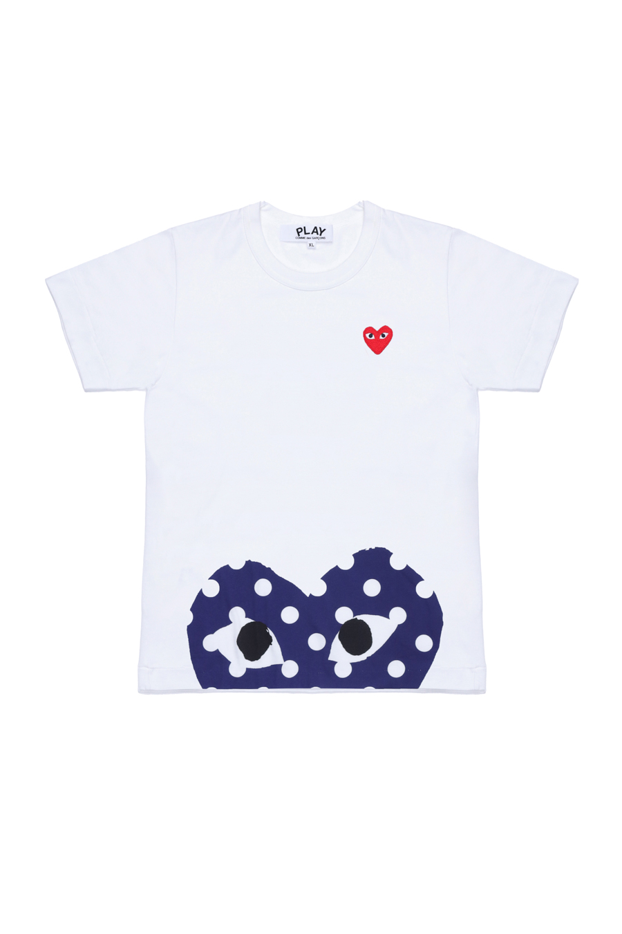 White cotton heart print T-shirt from Comme Des Garçons Play. Featuring a round neck, short sleeves, a printed logo to the front and a red heart patch at the chest.