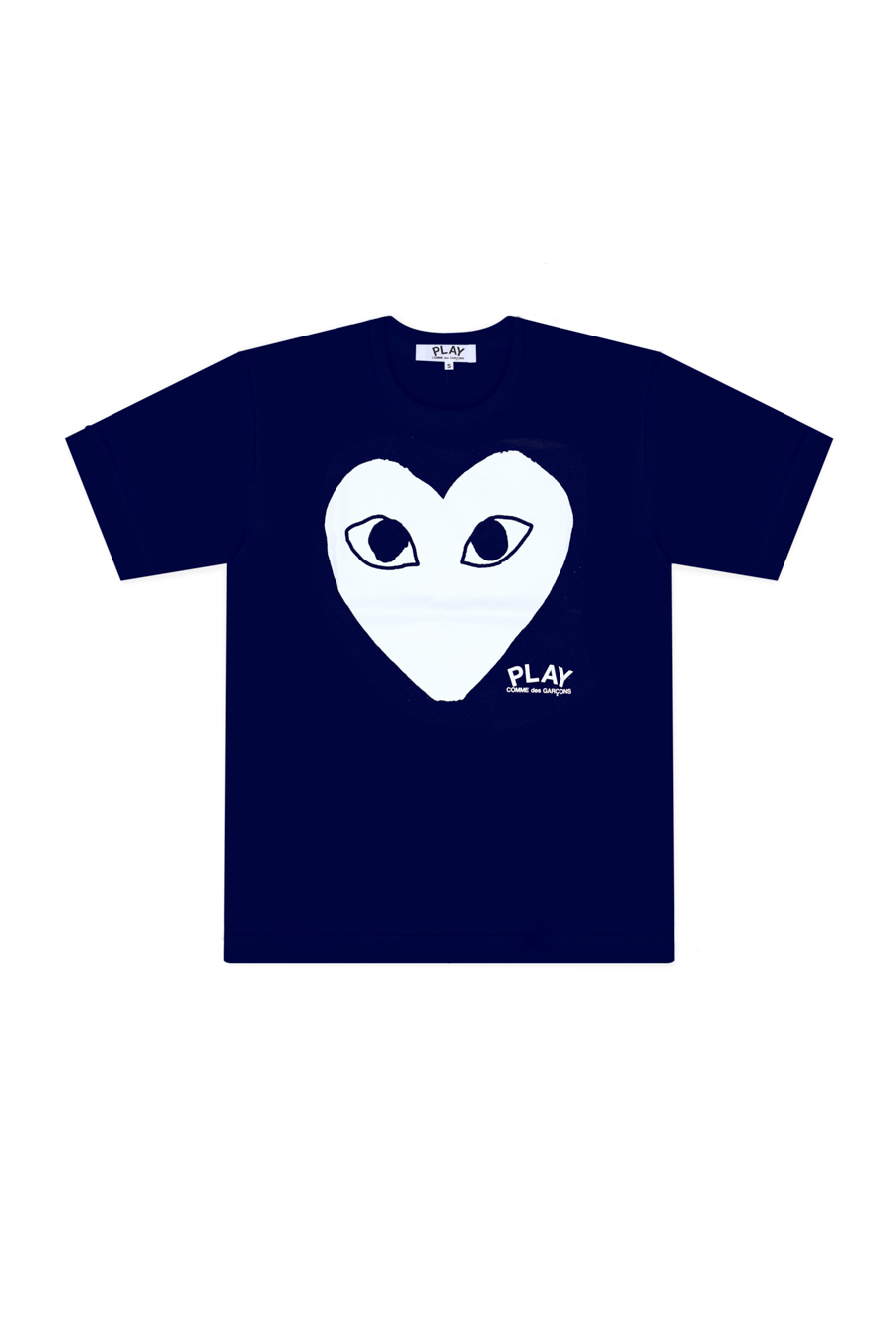 Navy cotton printed T-Shirt from Comme Des Garçons Play. Featuring white heart print logo, short sleeves, round neck, and a straight hem.